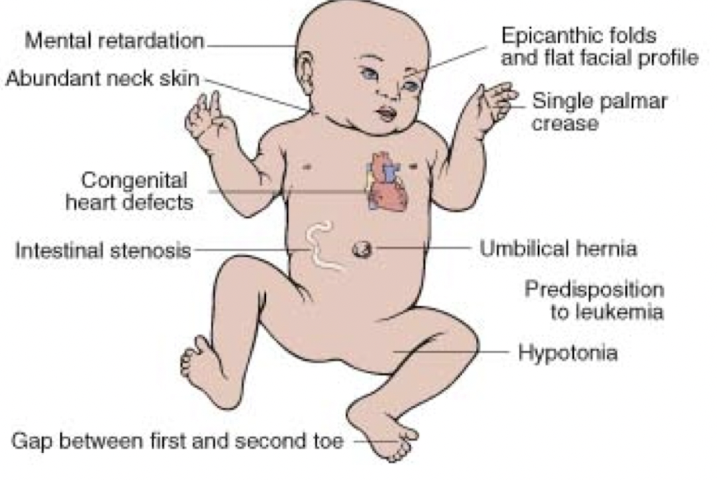Decreased intellectual ability, severe hypotonia in newborns, congenital abnormalities, increased risk of acute leukemia, abnormal immune response