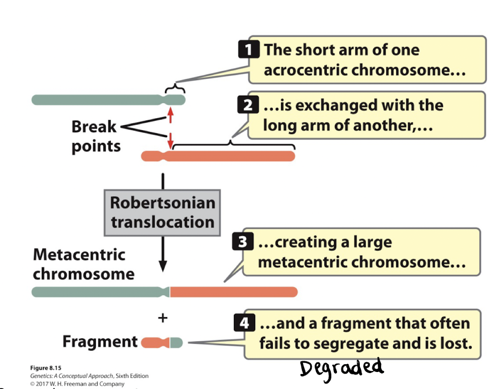 Translocation involving two acrocentric chromosomes. The short arm of one chromosome is exchanged for the long arm of another to create a larger metacentric chromosome. Offspring are phenotypically normal. Any chromosome fragments that fail to integrate at degraded.