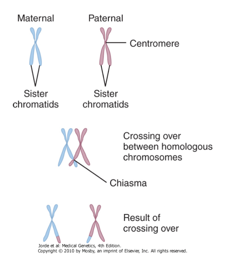 Recombination via crossing over between homologous chromosomes