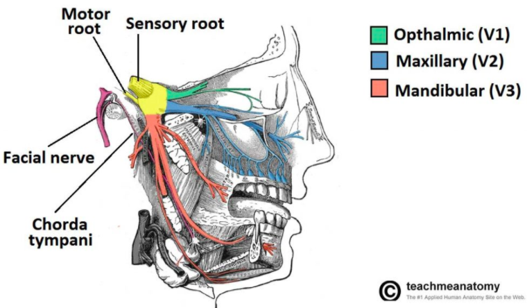Then gives rise to 1) opthalmic –> exits via superior orbital fissure 2) maxillary –> exits via foramen rotundum 3) mandibular –> exits via foramen ovale into infra-temporal fossa
