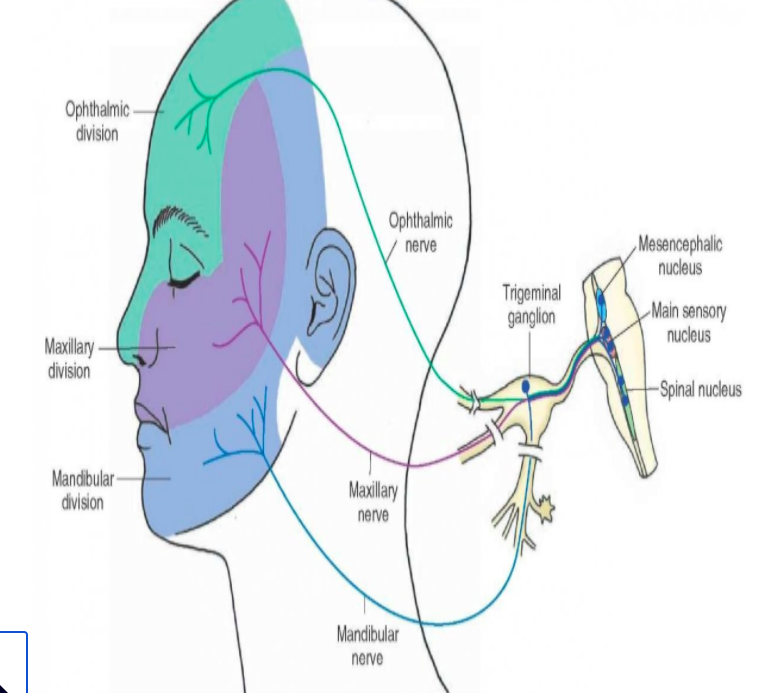 In middle cranial fossa, sensory root expands to form TRIGEMINAL GANGLION. Located lateral to the cavernous sinus, in depression of temporal bone - trigeminal cave.
