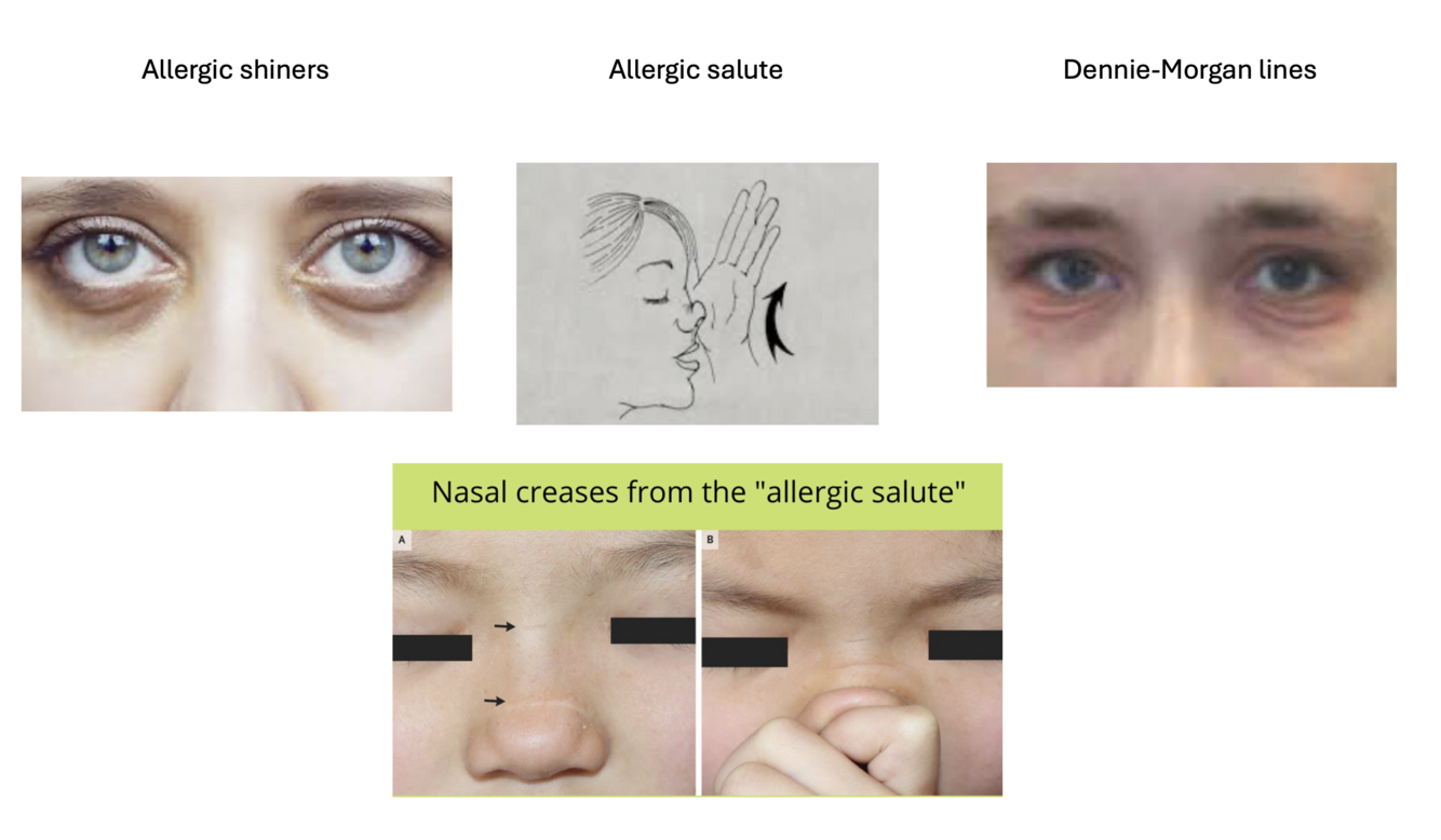 Allergic: Nasal itching, sneezing, atopy association.