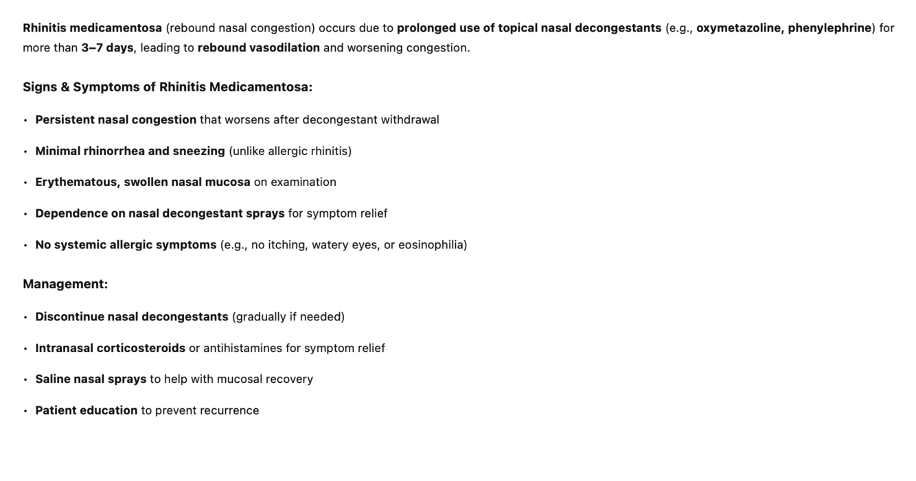 Rebound congestion from prolonged use (>3-5 days) of nasal decongestants (Oxymetazoline, Phenylephrine)