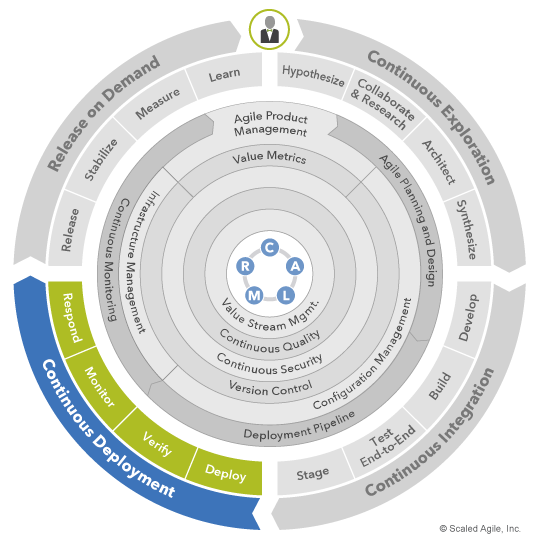 As Figure 3 illustrates, continuous deployment is enabled by SAFe’s CALMR approach to DevOps (center) as well as several practice domains (inner rings). Each of the four activities (in green) is a collaborative effort that draws upon DevOps expertise from multiple domains to maximize delivery speed and quality.