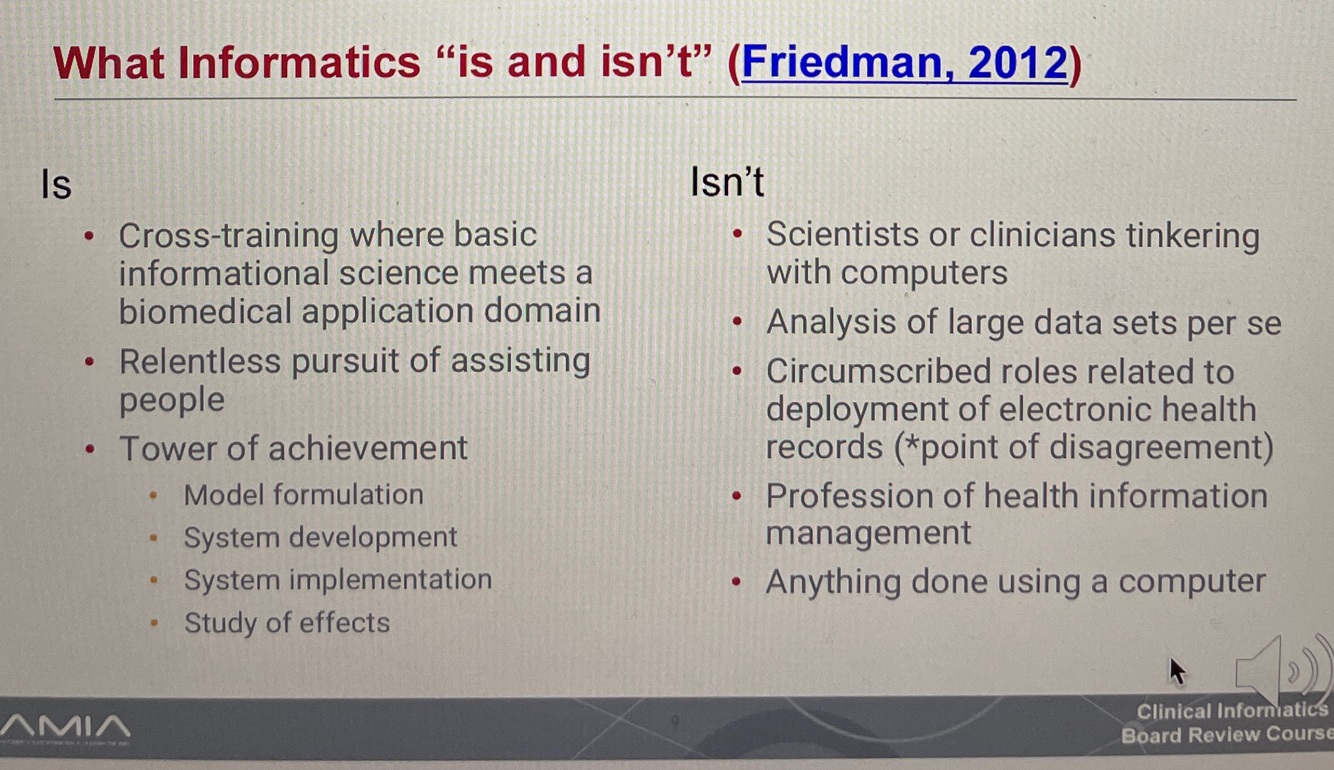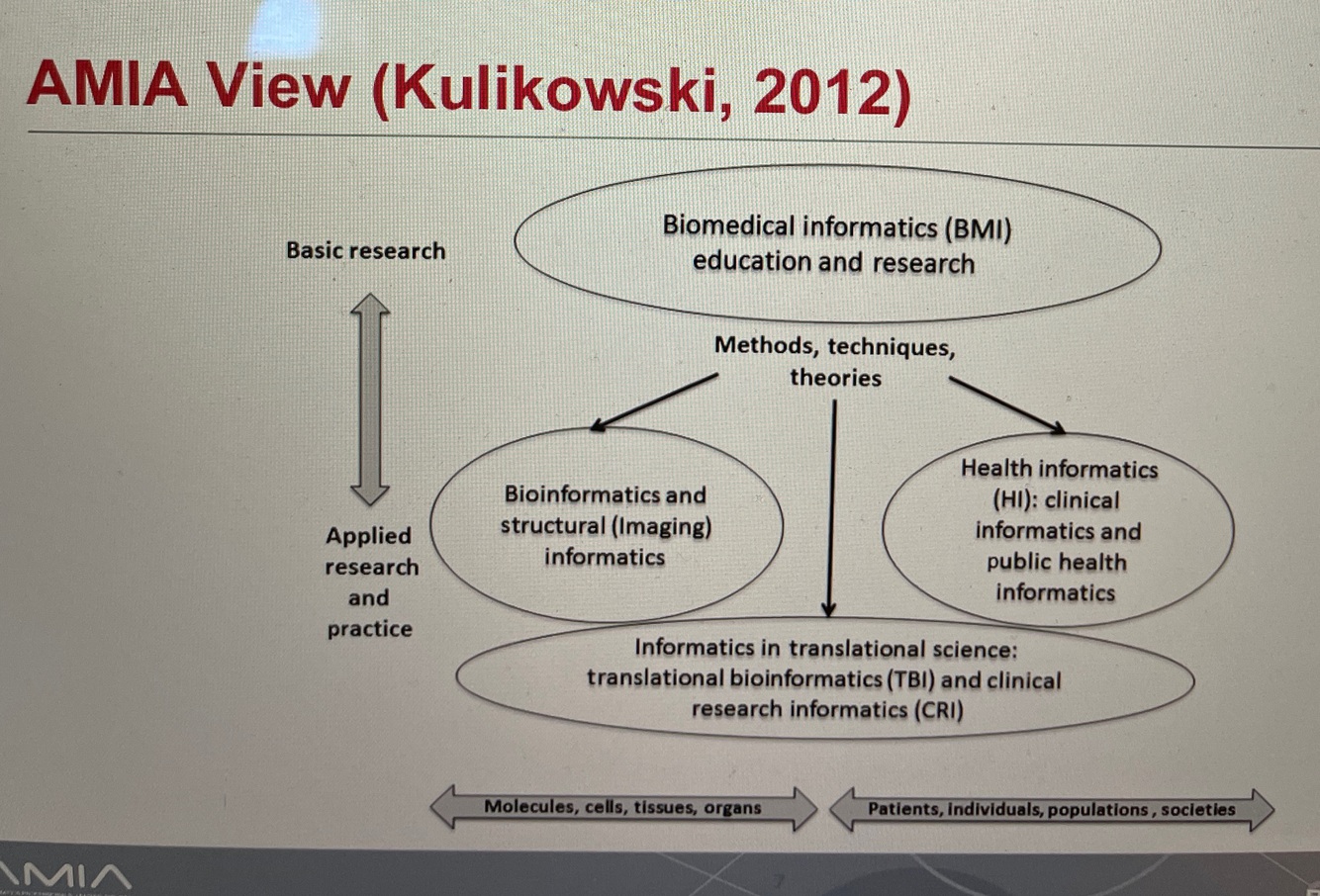 Biomedical informatics (BMI) = the interdisciplinary field that studies the effective use of biomedical data for scientific inquiry, problem solving, and decision making, to improve human health.”