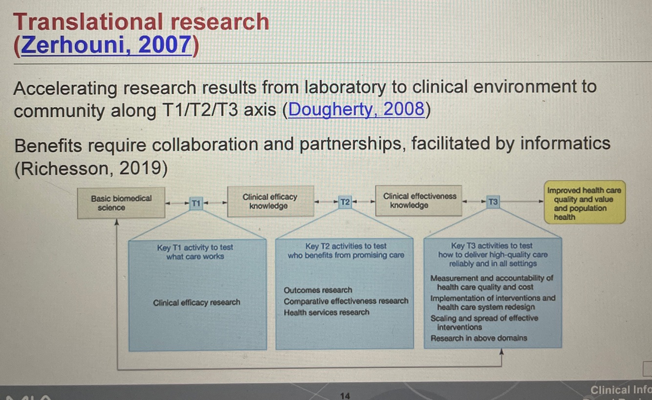 T1 includes “bench-bedside,” patient-oriented research, and clinical efficacy research. “What treatment works?” Ex. Clinical trials