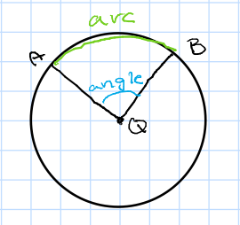 a set of points at a given distance (radius) from a given point (center) in a given place