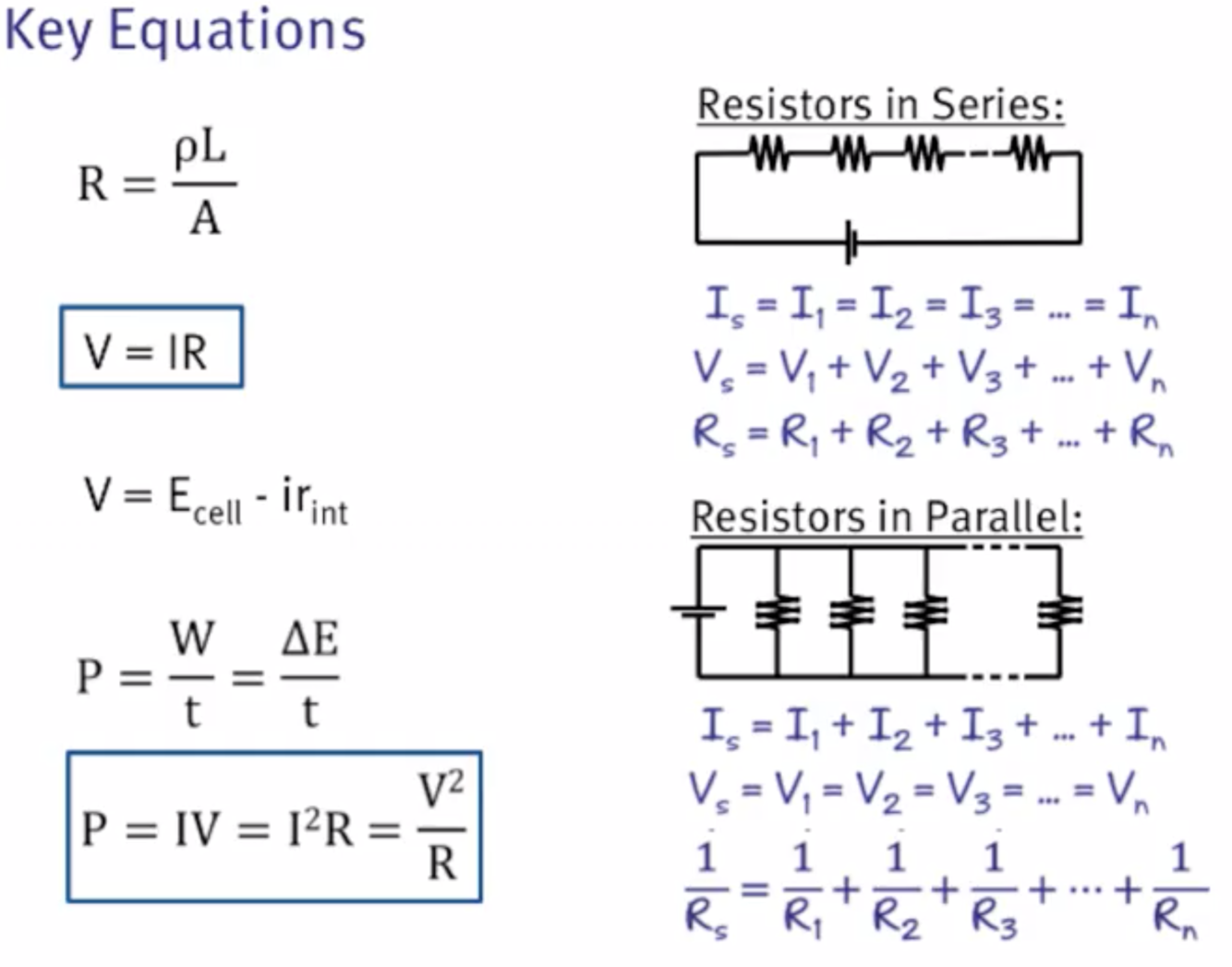What are all the important equations related to Resistors that are tested on the MCAT?