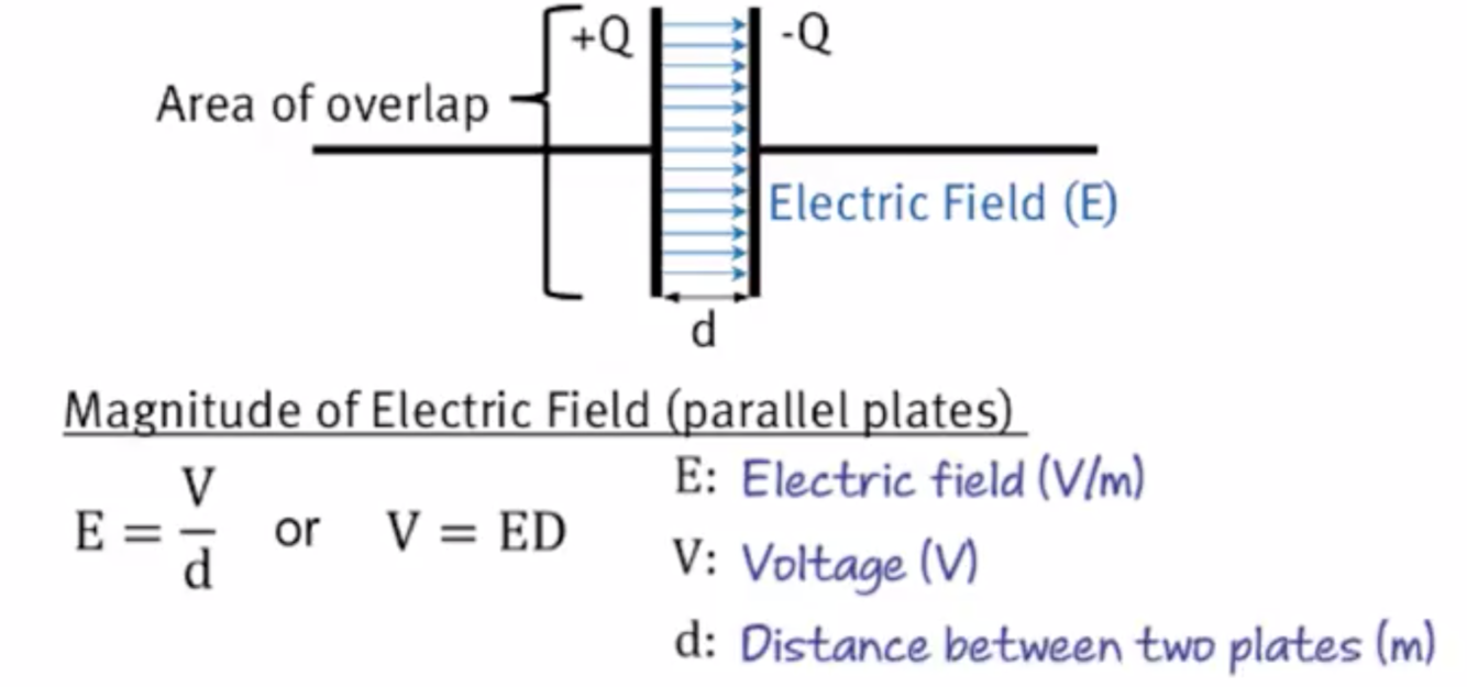 In what direction do electric fields travel/point and what are the equations that relate electric fields to parallel plate capacitors?