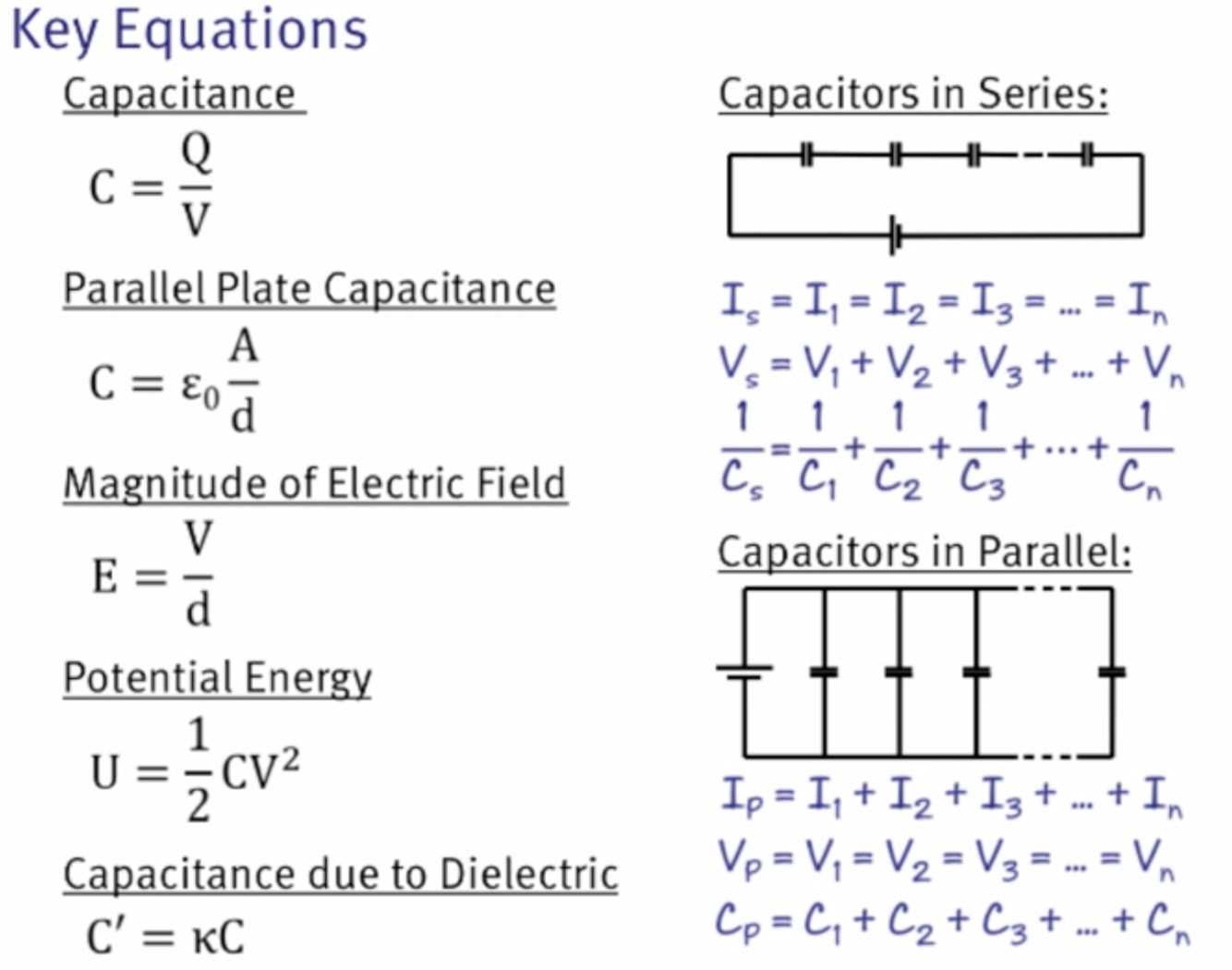 What are the key equations associated with capacitance?