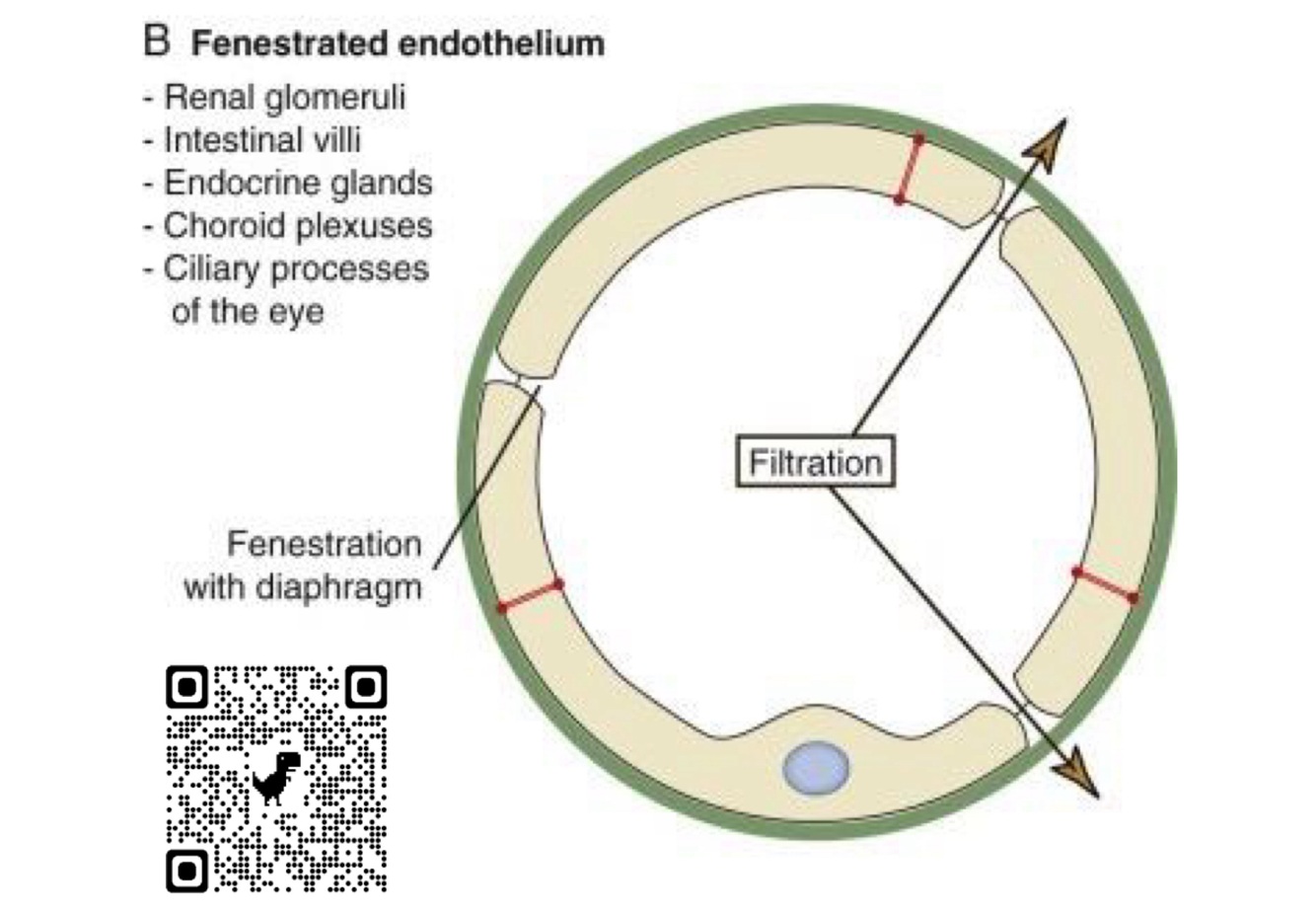 seen in = renal glomeruli, intestinal villi, endocrine glands, choroid plexuses, ciliary processes of eye