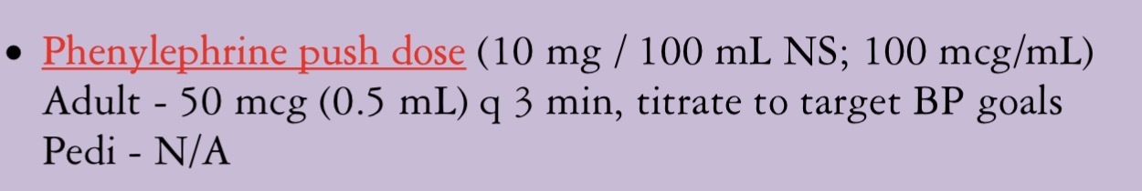 * Epinephrine (push dose): (0.1 mg in 10 mL NS) Adult: 10 mcg (1 ml) IV/IO, repeat q 5-minutes PRN, max total dose 50 mcg (5 ml); Pedi: 1 mcg/kg (max single dose 10 mcg), repeat q 5-minutes PRN, max total dose 50 mcg (5 ml)