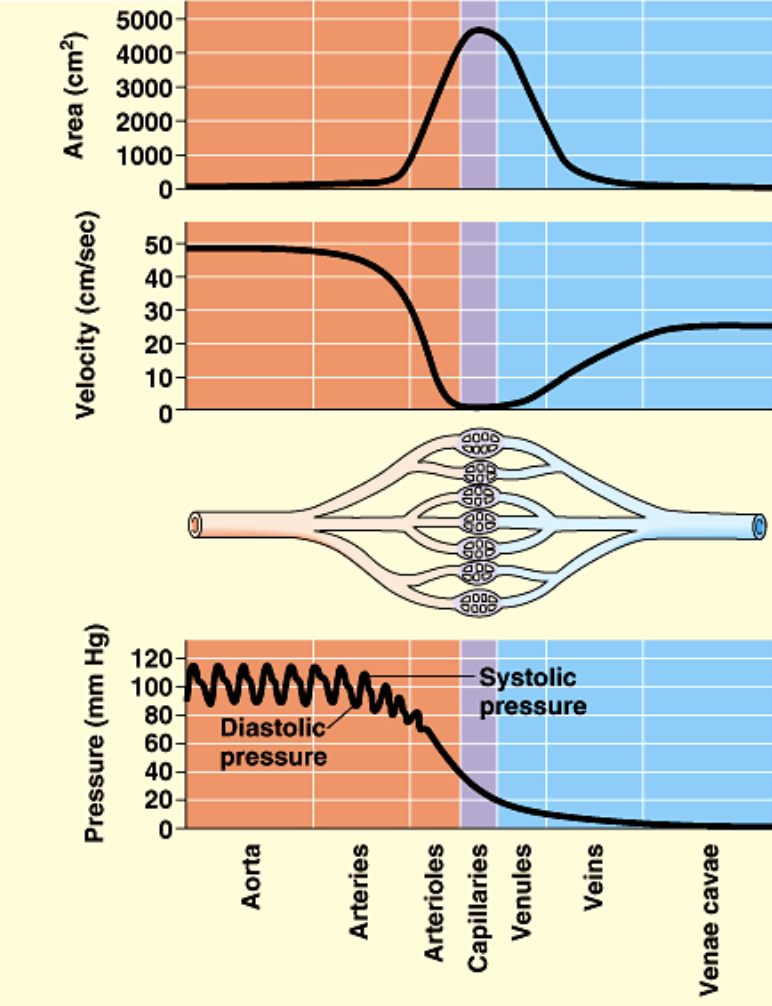 Blood pressure and velocity through different blood vessels