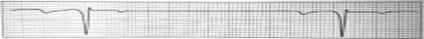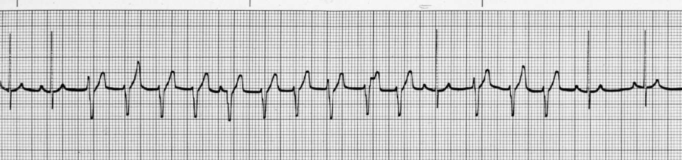 Inga P-vågor leder till normala QRS. De QRS som syns är flyktslag som produceras av ventrikeln el AV knutan (= kan se ut som normala el ventrikelslag). Atrierytmen är snabbare än ventrikelrytmen