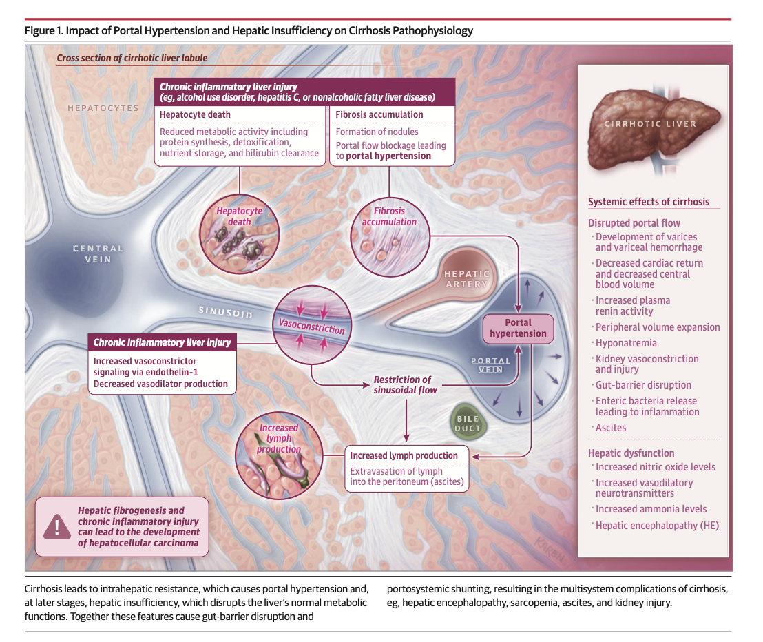 Una alteración en el flujo portal genera una diminución en el cardiac return y decreased central blood volume que genera un aumento en SRAA y entonces expande volumen (miocardiopatía cirrótica), VC renal y eso predispone a pacientes a hiponatremia, ascitis y lesión renal sobretodo en el setting de depleción de volumen, infección o hemorragia.