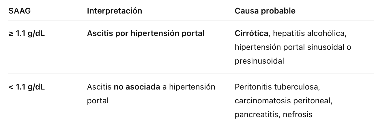 Gradiente albúmina sérica–albúmina en líquido ascítico (SAAG) mayor a 1.1 y especialmente si proteínas del líqudio ascitico <2.5 g/dL