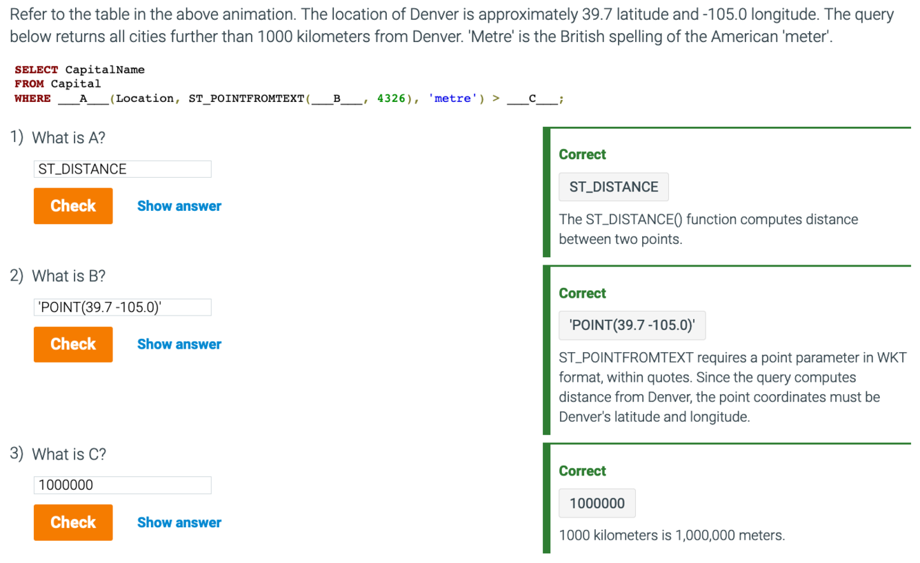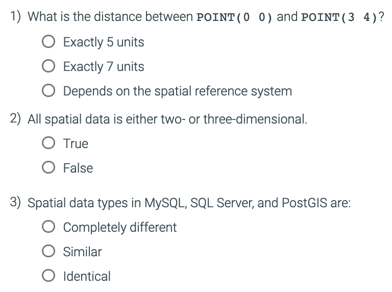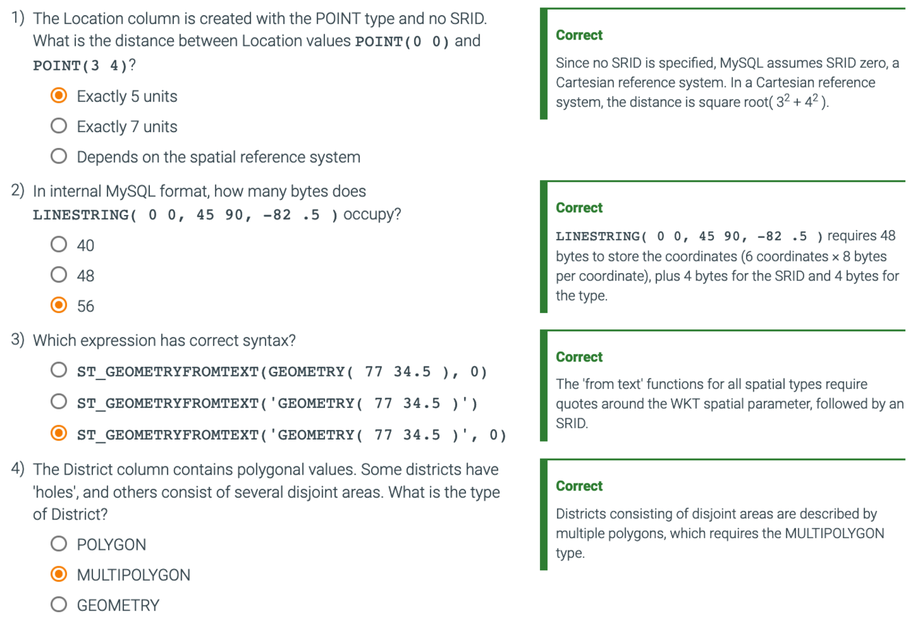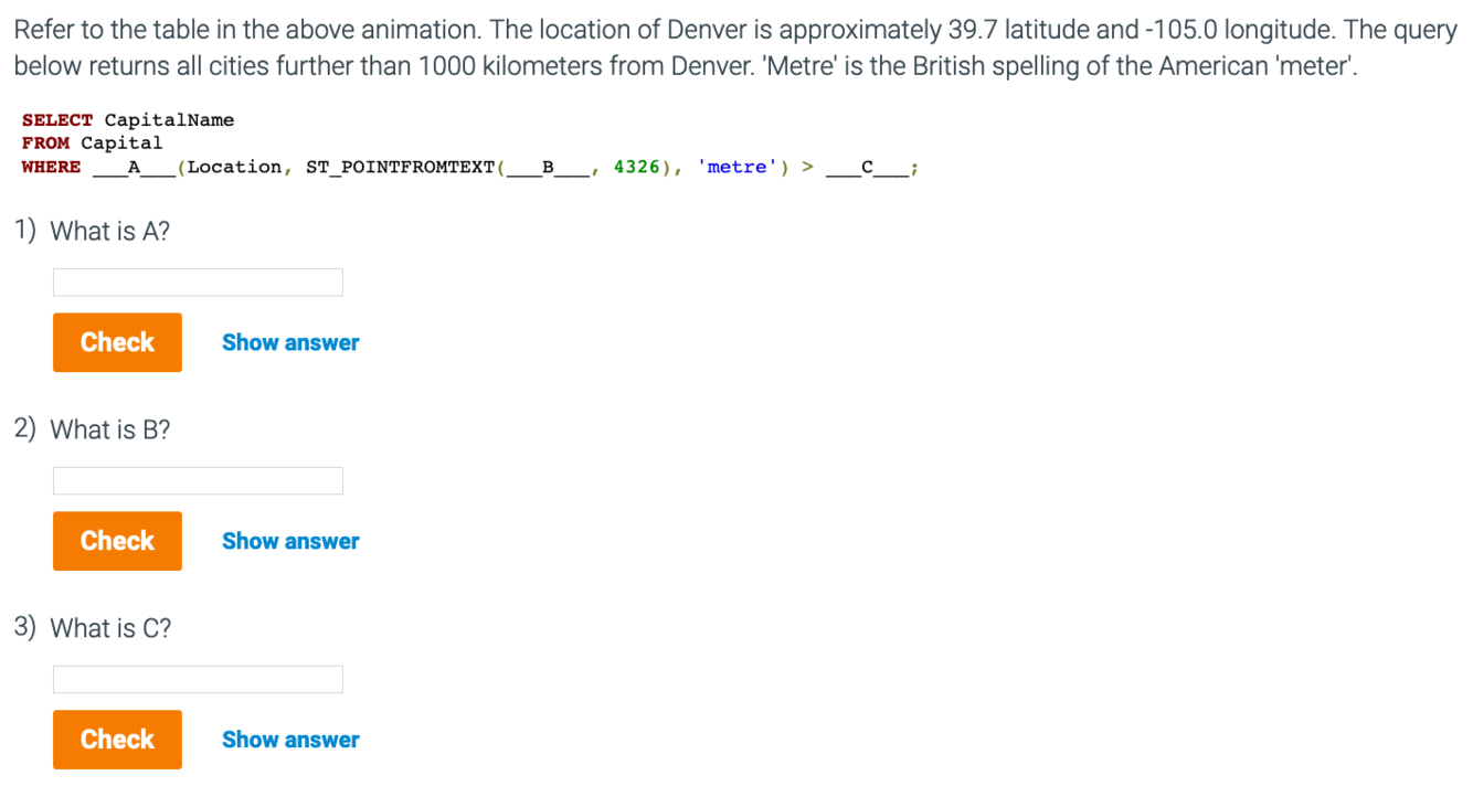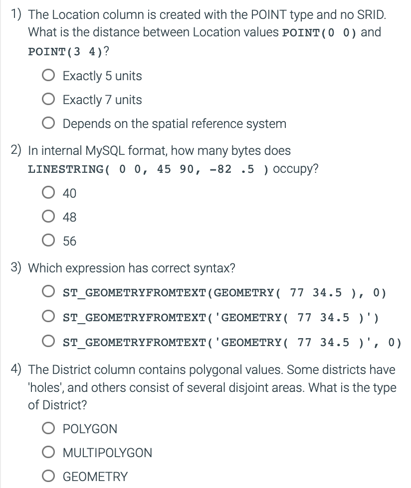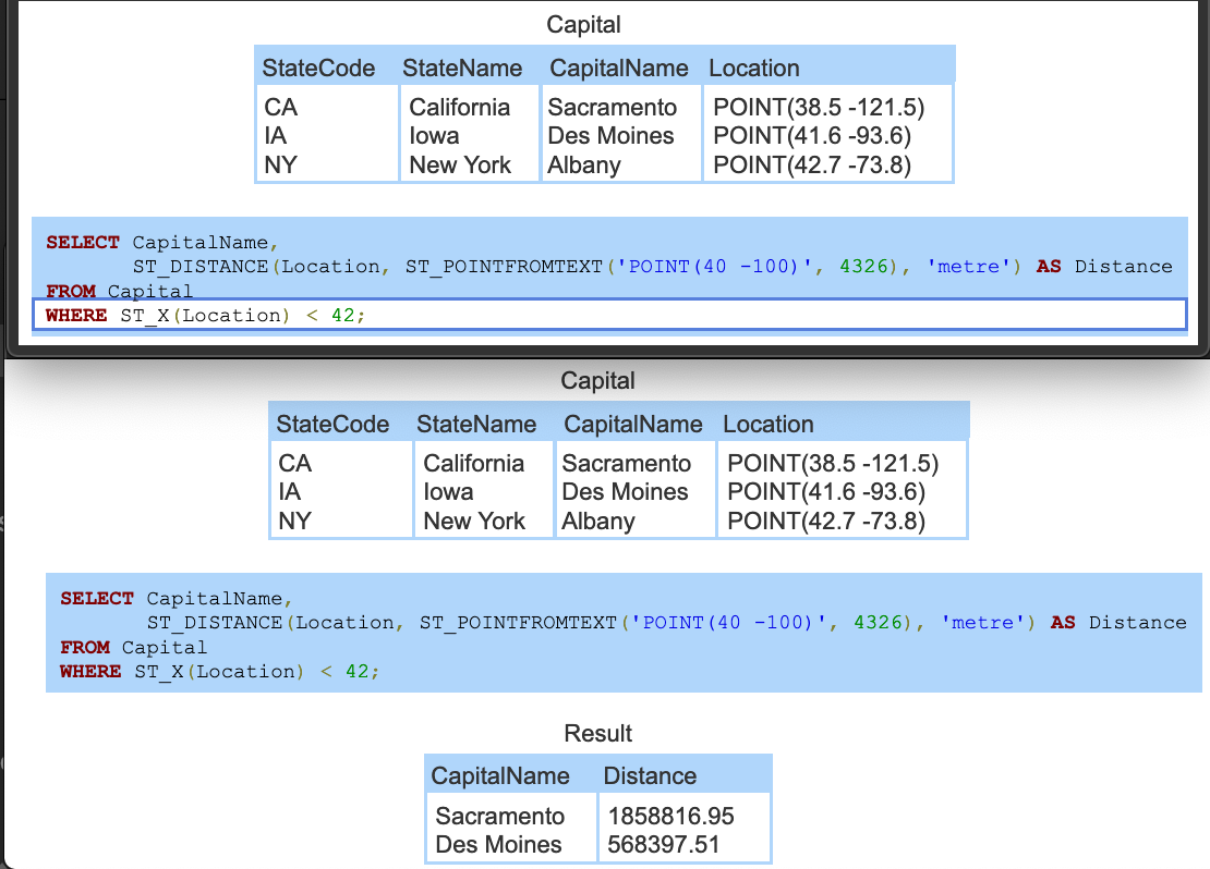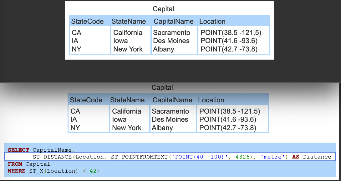 ST_DISTANCE() computes each capital’s distance in meters to 40° latitude and -100° longitude. MySQL uses the British spelling ‘metre’ rather than the American spelling ‘meter’.