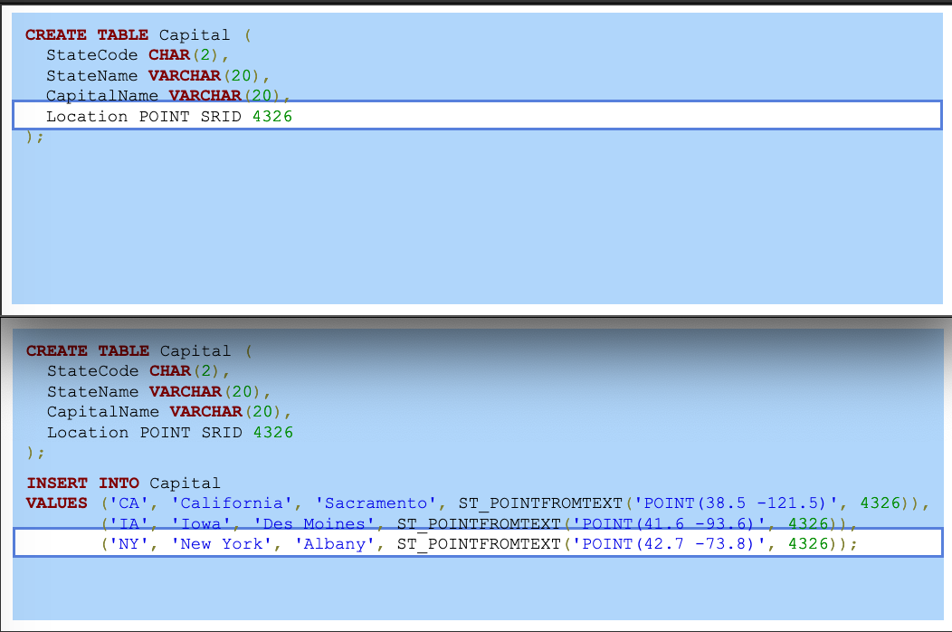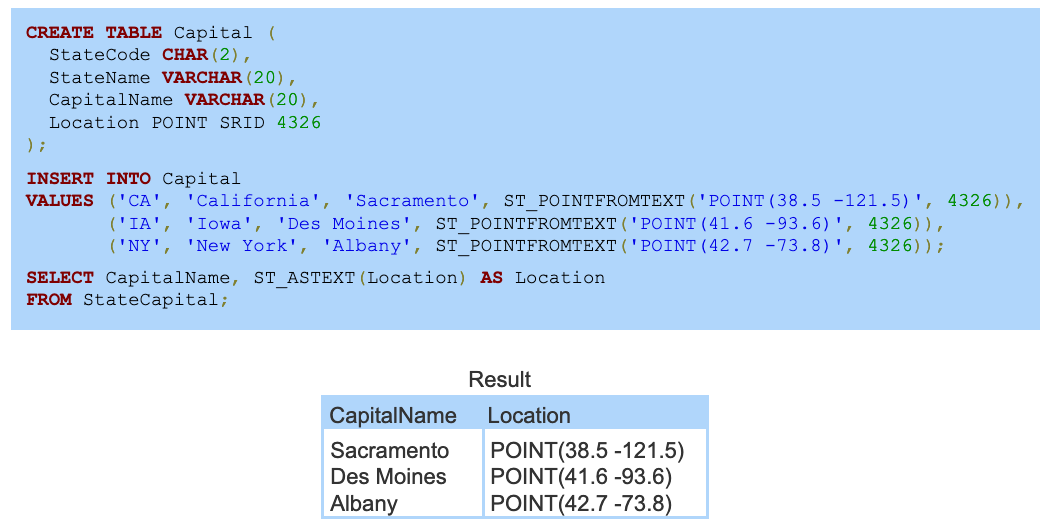 The Capital table contains state capitals. Location values are latitude and longitude in spatial reference system 4326.