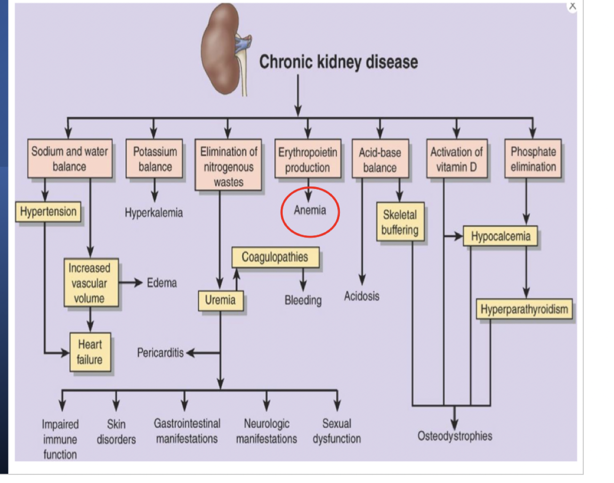 Anemi är vanligt förekommande hos patienter med en måttlig till svår njurskada och beror huvudsakligen på en nedsatt produktion av erytropoietin, vilket är det hormon som stimulerar bildningen av röda blodkroppar genom erytropoesen.