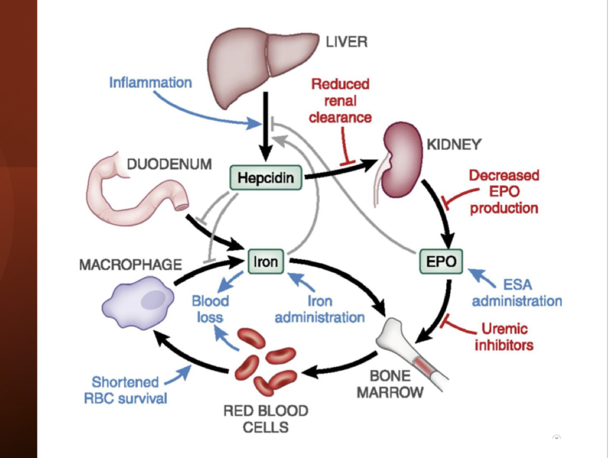 HIF har även en viktig funktion i levern, där det hämmar produktionen av hepcidin → effektivare järnupptag i tarmen samt järnutnyttjande i benmärgen (erytropoes). Däremot så kommer inflammation(har en låggradig inflammation i kroppen vid njursvikt) och järnöverskott istället stimulerar hepcidin, som då hämmar järnupptag och dess transport till benmärgen. HIF förlorar alltså sin funktion i levern.