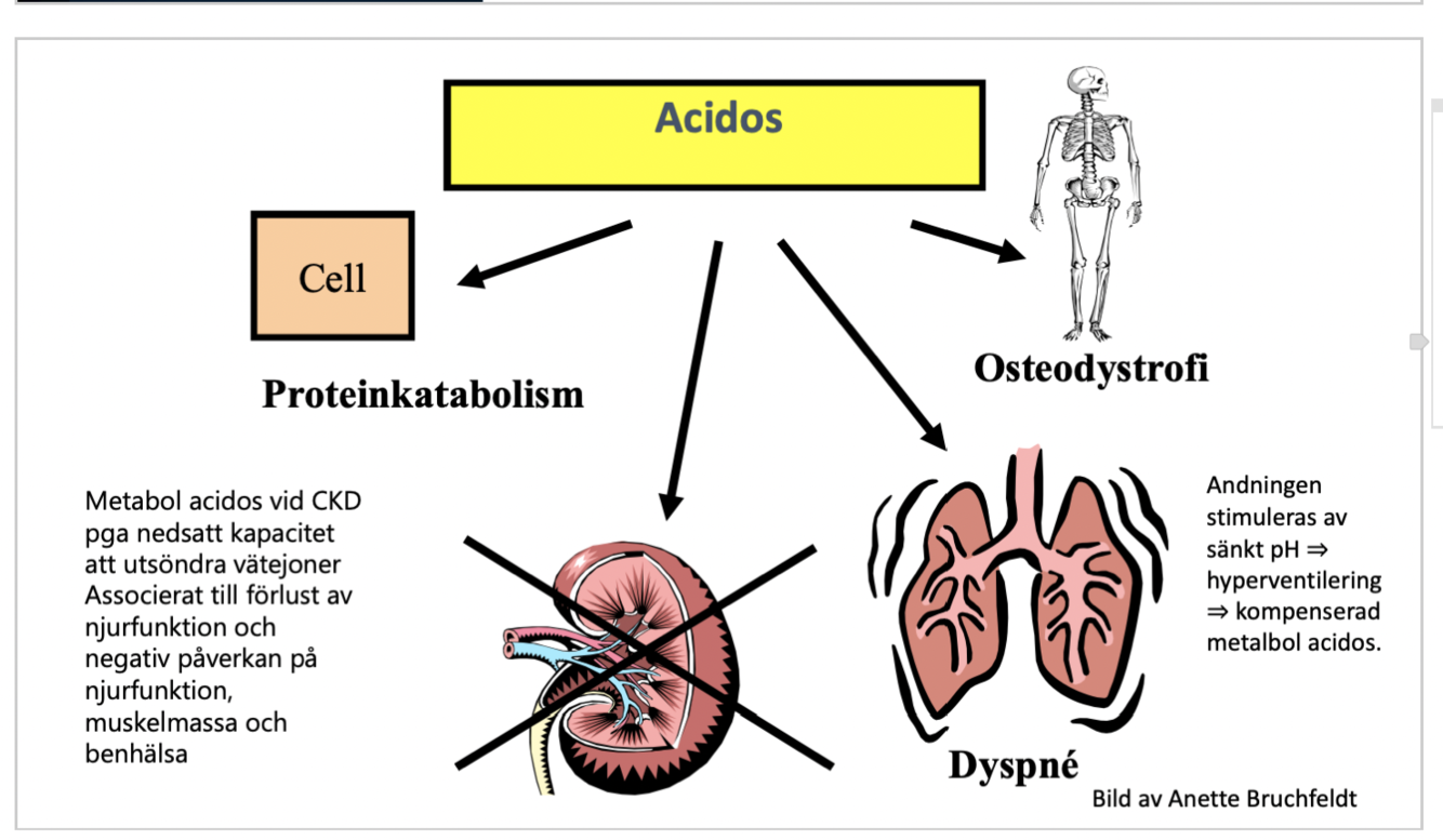 Vätejonkoncentrationen i blodet måste hållas konstant. Detta sker genom flera olika buffertsystem, varav bikarbonat är det viktigaste. Njurarna kan påverka detta system genom att variera bikarbonatresorptionen (karbanhydras är viktigt enzym) och vätejonutsöndringen. Njursvikt leder i regel till en metabol acidos eftersom CKD-patienter har en nedsatt kapacitet att utsöndra vätejoner samt reabsorbera HCO3-. Detta beror främst på den sänkta Na+-koncentrationen i lumen → Na+/H+ -antiporters fungerar sämre → mindre utsöndring av H+, vilket både är väsentligt för att höja pH samt reabsorbera bikarbonat.