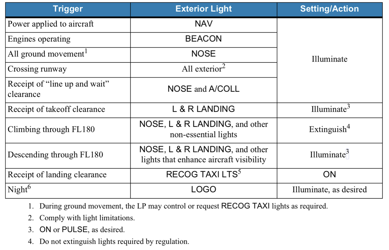 Explain what aircraft lights to turn on/off for…