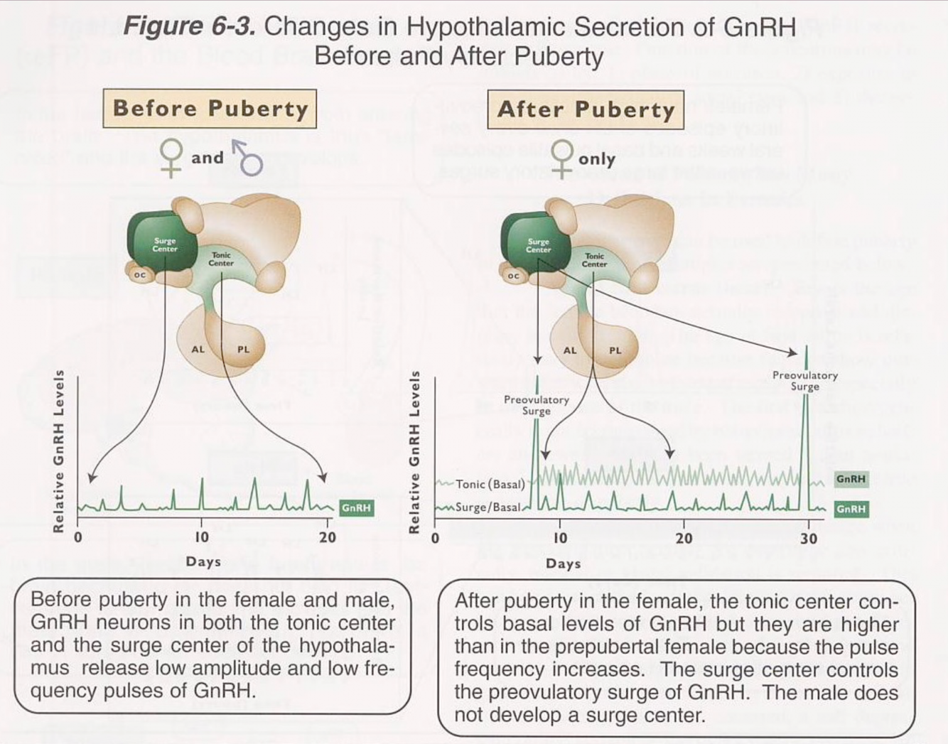 - Females: tonic center controls post-pubertal basal levels of GnRH; surge controls pre-ovulatory GnRH surge (which initiates LH surge)