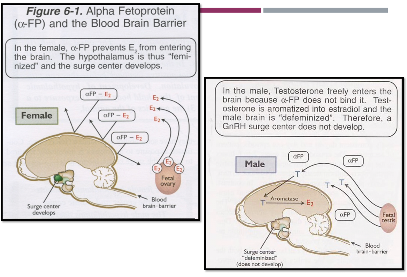 The surge center develops in females b/c estradiol (which is released by the fetal ovary) is prevented from entering the BBB via alpha fetoprotein (alpha-FP)