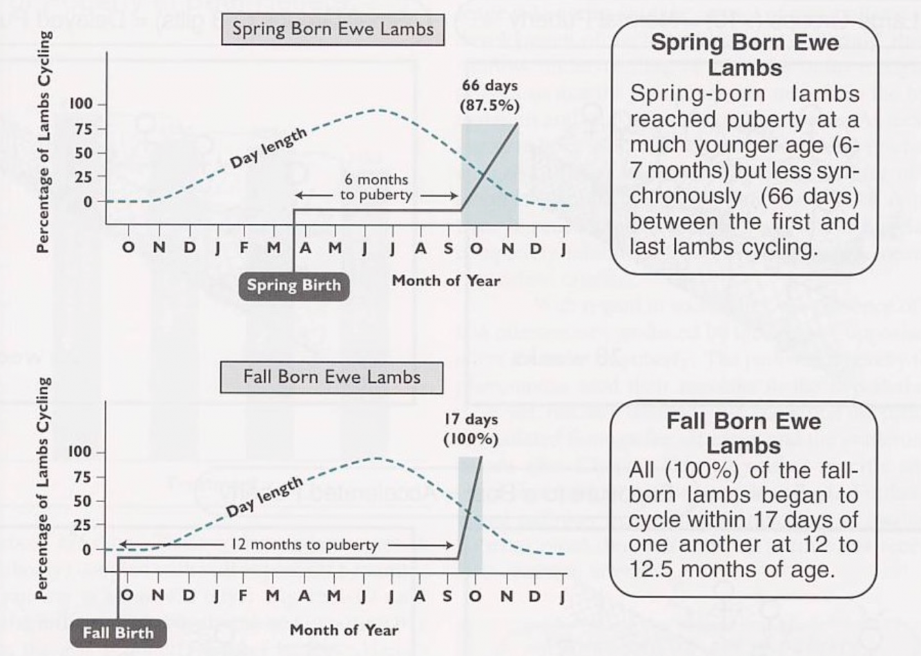 - Spring-born: puberty in fall (age of 1st puberty = ~7 months)