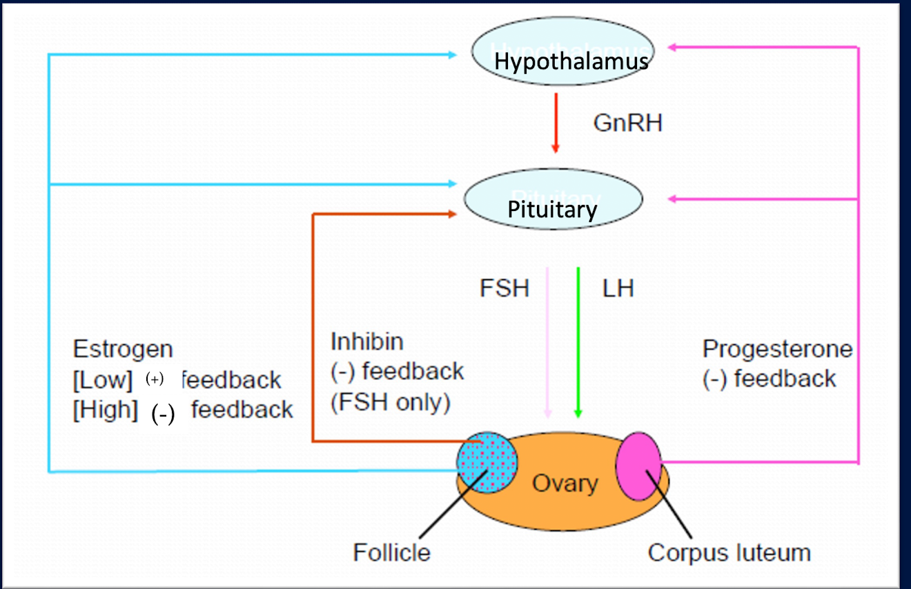 incr. [E2] -> (-) feedback on GnRH; inhibin (-) feedback FSH
