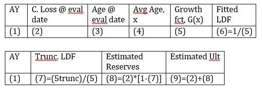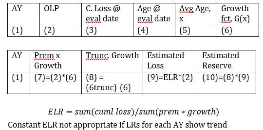 rather than calc IBNR for each AY, estimate development for next CY period beyond latest diag -> take difference in growth fct @ 2 evaluation ages and mult by estimated ult loss
