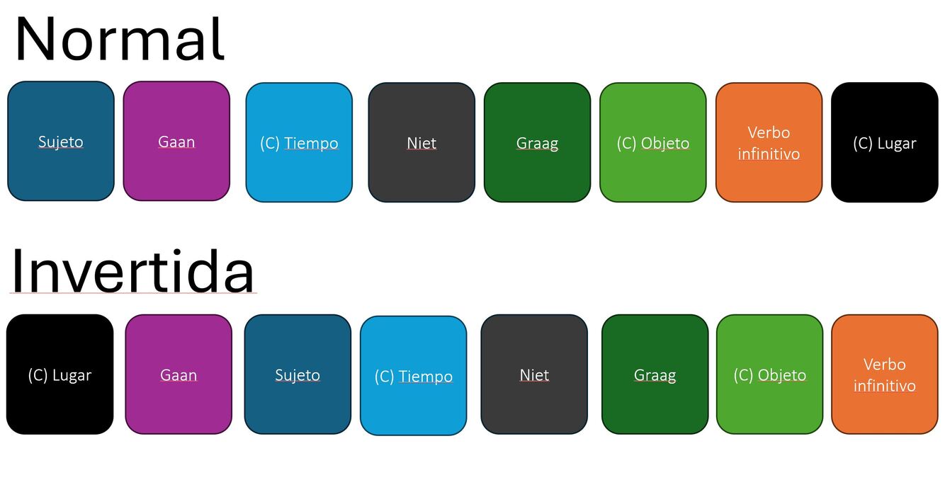 Wij gaan vanavond graag een film kijken in New York - Nosotros disfrutamos ver una película esta noche (Sujeto + Gaan + Complemento de tiempo+ Graag + complemento objeto + infinitivo + complemento de lugar)