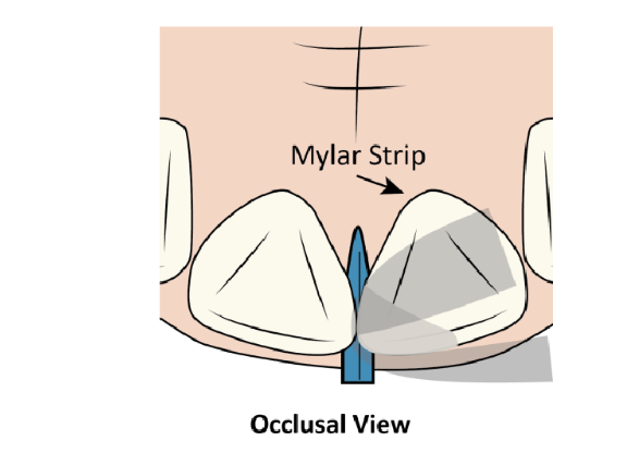 Placement of a clear matrix on the back side of the tooth held in place with a wedge and finger pressure ensures a surface to build material up against. After curing, the matrix is carefully folded across the labial to: