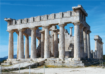 Later Doric architects also modified the plan of their temples (compare Fig. 5-15). The Aegina temple’s cella has two colonnades of two stories each (originally with a statue of the deity between them).