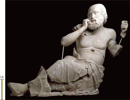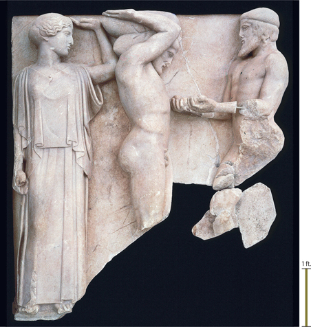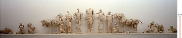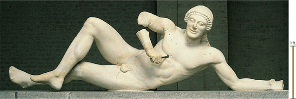 The restored view suggests how colorful Greek temples were. The designer solved the problem of composing figures in a pediment by using the whole range of body postures from upright to prostrate.