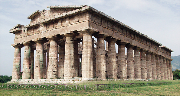 The Paestum temple reflects the Olympia design but lacks the pedimental sculpture of its model