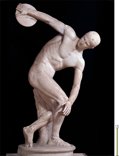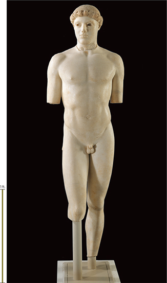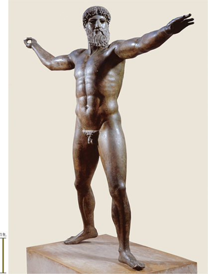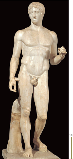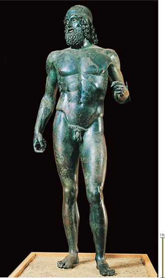 the bronze Riace warrior statue has inlaid eyes, silver teeth and eyelashes, and copper lips and nipples (Fig. I-17). The contrapposto is more pronounced than in the Kritios Boy