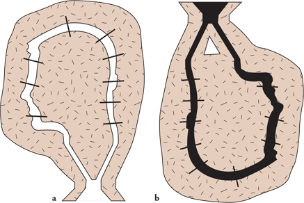 Drawing a shows a clay mold (investment), wax model, and clay core connected by chaplets. Drawing b shows the wax melted out and the molten bronze poured into the mold to form the cast bronze head.