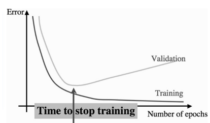 We want to stop when the error of the validation data set starts to increase. The error will increase because the model is starting to over fit