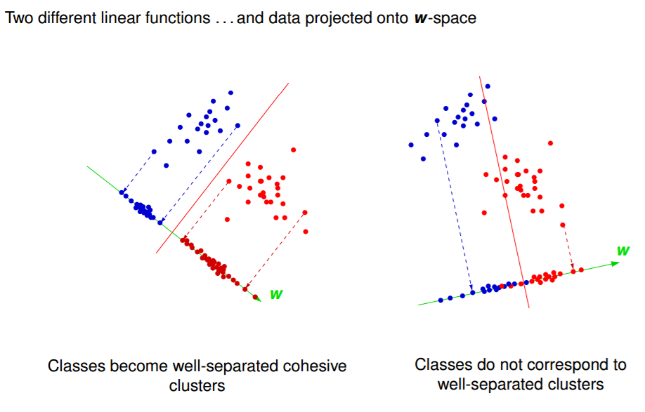 Principle: find 1-dimensional projection w, such that clusters defined by class labels are well separated and cohesive