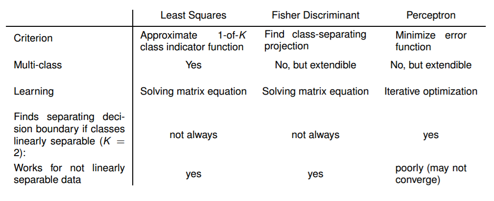 What are interesting comparisons with the fisher discriminant, least squares and the perceptron?