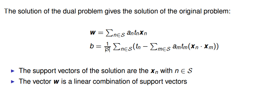 The solution of the dual problem gives the solution of the original problem eg. finding the optimal line.
