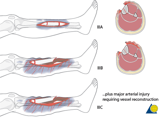 Gustilo and Anderson System depending on size of wound, degree of contamination and bony disruption Grade 1 = low energy less than 1cm Grade 2 = over 1cm with moderate soft tissue damage Grade 3 = split into a, b, c depending on contamination and vascular injury where 3c is worst and has separate scoring system