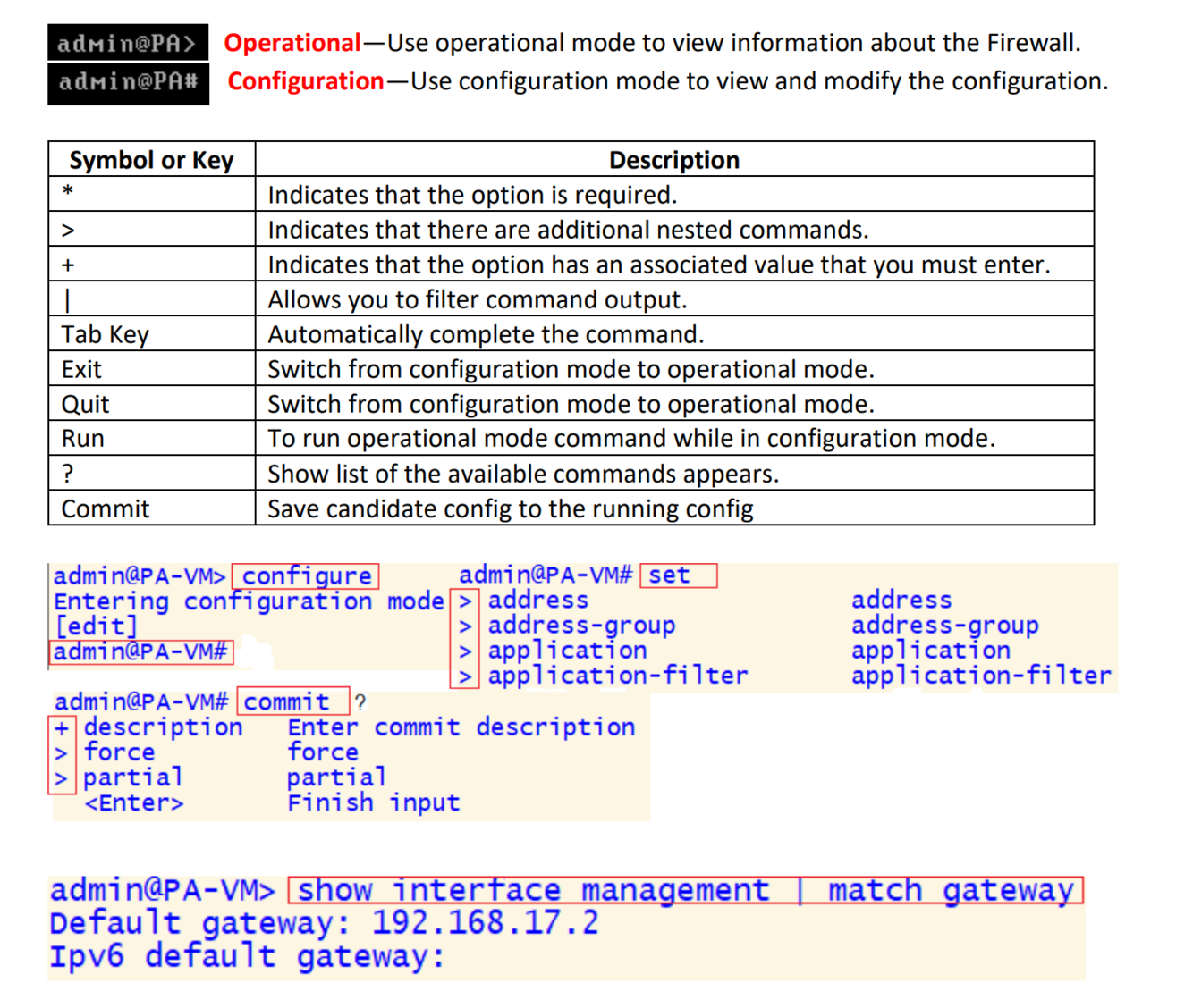 o Palo Alto Firewall Operational Mode, command prompt sign is a greater then sing ( >).