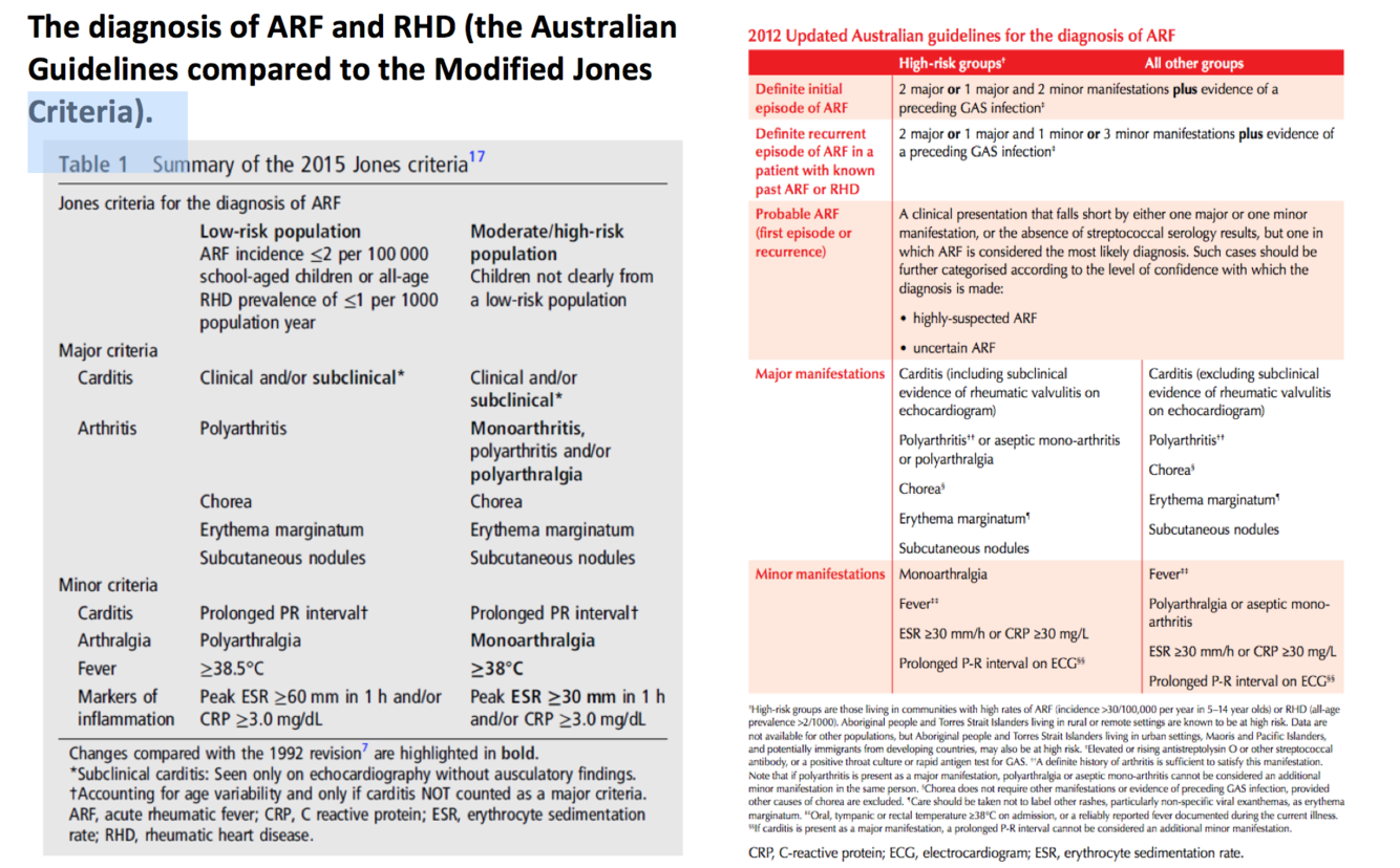 The diagnosis of ARF and RHD (the Australian Guidelines compared to the Modified Jones Criteria).