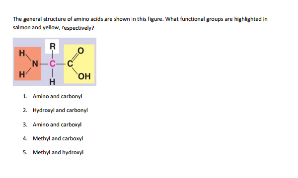 The general structure of amino acids are shown in this figure. What functional groups are highlighted in salmon and yellow, respectively?