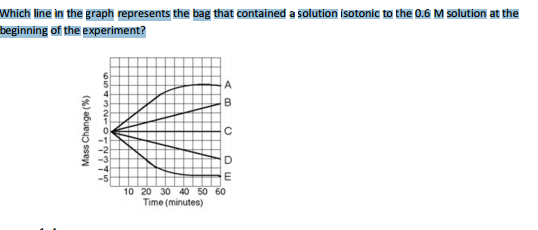 Five dialysis bags constructed of membrane which is permeable to water and impermeable to sucrose, were filled with various concentrations of sucrose and then placed in separate beakers containing an initial concentration of 0.6 M sucrose solution. At 10‐minute intervals, the bags were massed (weighed) and the percent change in mass of each bag was graphed. Which line in the graph represents the bag that contained a solution isotonic to the 0.6 M solution at the beginning of the experiment?