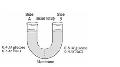 The solutions in the arms of a U‐tube are separated at the bottom of the tube by a selectively permeable membrane. The membrane is permeable to sodium chloride but not to glucose. Side A is filled with a solution of 0.4 M glucose and 0.5 M sodium chloride (NaCl), and side B is filled with a solution containing 0.8 M glucose and 0.4 M sodium chloride. Initially, the volume in both arms is the same. Refer to the figure to answer the following question.