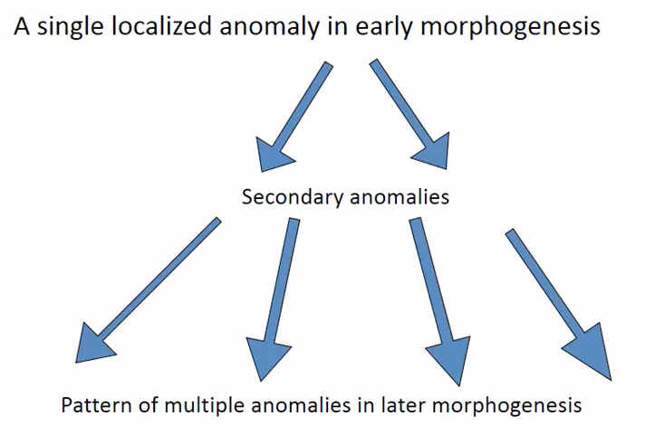 A pattern of malformations due to a cascading effect from a single minor alteration early in morphogenesis A single malformation that leads to a downstream effect as a result