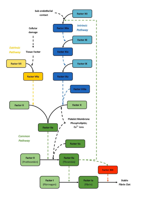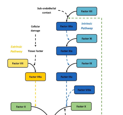 In addition to the formation of fibrin, thrombin activates many parts of the coagulation cascade via a positive feedback loop through the intrinsic pathway leading to the formation of large amounts of additional thrombin (a ‘thrombin burst’).